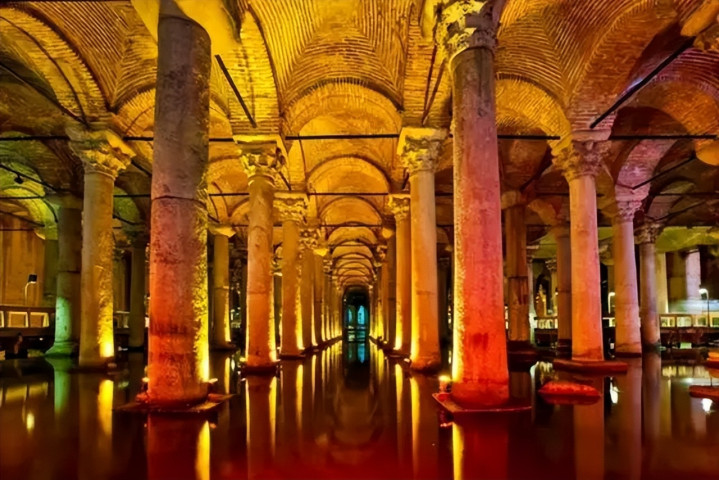 地下水宫(土耳其伊斯坦布尔)伊斯坦布尔古老的地下储水系统,与其说是水库,不如说更像地下宫殿。数百根雕刻大理石柱从水中升起,在昏暗的灯光下,柱子的倒影形成一片奇幻的石柱森林